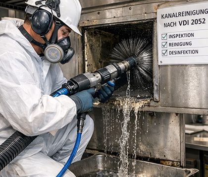 Küchenabluftanlagen stellen durch die Fett- und Frasenablagerungen ein erhöhtes Brandrisiko dar. Statistisch sind in Restaurants oder Hotels die Küchenbrände am höchsten. Doch nicht nur das offensichtliche Fett und Öl beim Kochen in der Restaurant- oder Hotelküche stellen ein Brandrisiko dar. Auch Fettansammlungen an unsichtbarer Stelle sind eine enorme Gefahr. So sammeln sich beispielsweise in Lüftungen und Rohrkanälen, die durch die Küche führen oder die Abluft nach draußen leiten, häufig Reste von Öl und Bratfett. Ein kleiner Funke genügt – und schon steht ein komplettes Rohr oder ein Lüftungskanal in Flammen. Um nicht nur die Langlebigkeit und Effizienz Ihrer Küchenabluftanlage zu garantieren, sondern auch Küchenbränden vorzubeugen, sind unsere professionelle hygienischen- und brandschutztechnischen Reinigung nach VDI 2052 wichtig!